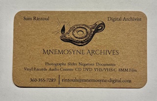 I specialize in converting physical items into various digital formats. Includes but not limited to: Documents, Photographs, Slides, Negatives, VHS tapes, 8mm film, Vinyl, Cassettes, Mini-Cassettes and Mini-DV tapes. Additional services that I offer are Digital Restoration, Metadata and Transcription. I am an independent contractor and am open to traveling for work. I work with private clients and institutions, most recently being the Clark County Historical Museum, the Cowlitz County Historical Museum and the Washington State University-Vancouver Archives.