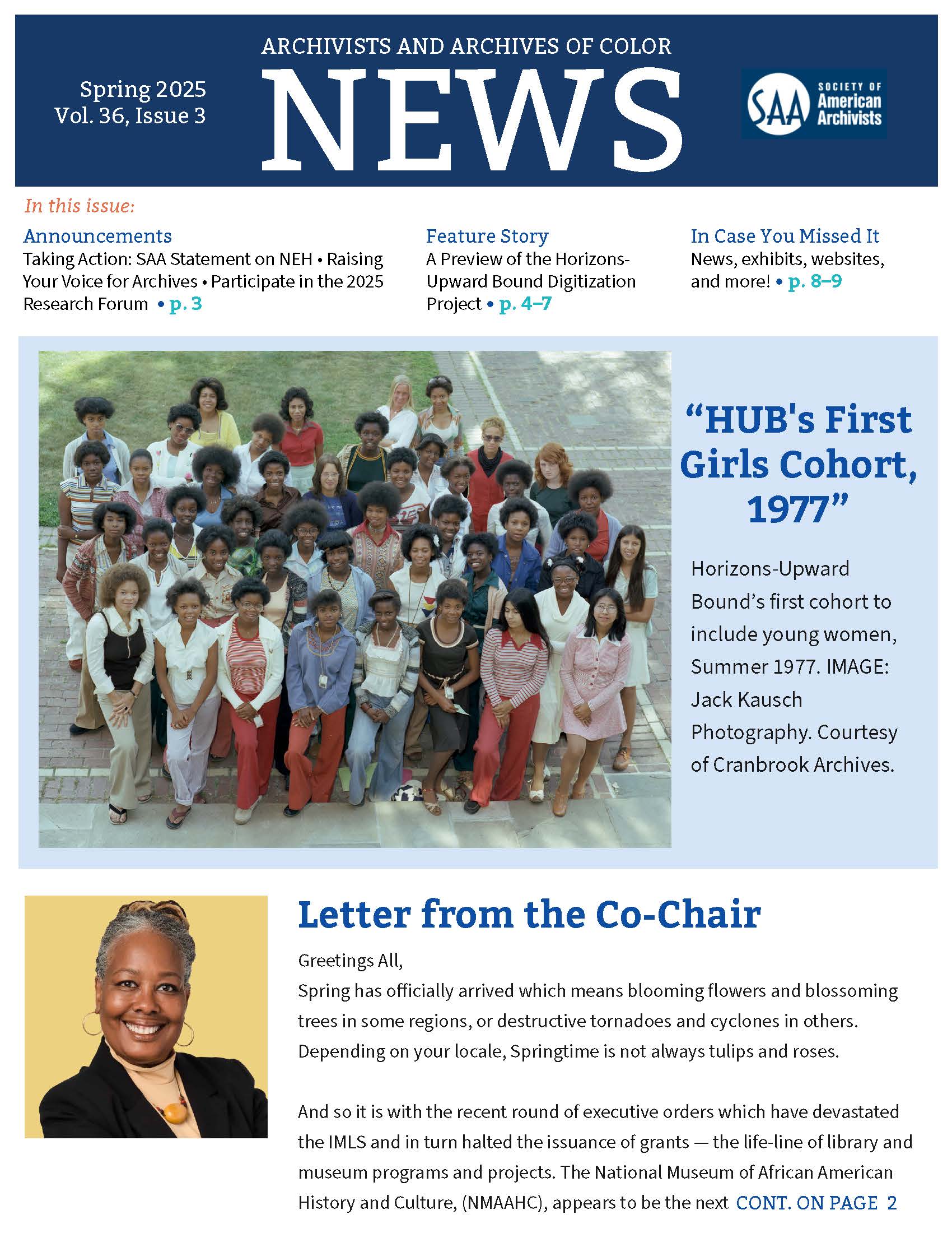 Letter from the Co-Chair: Tamera Coleman Announcements: Taking Action: SAA Statement on NEH • Raising Your Voice for Archives • Participate in the 2025 Research Forum; Feature Story: A Preview of the Horizons-Upward Bound Digitization Project; In Case You Missed It; We Want to Hear from You! Contribute to the AAC Newsletter; Your 2024-2025 AAC Steering Committee |